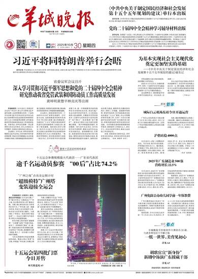 中共广东省委主管、主办 羊城晚报社出版 1957年10月1日创刊 27℃ 21℃ 2025年10月30日 乙巳年九月初十 星期四 责编/徐雪