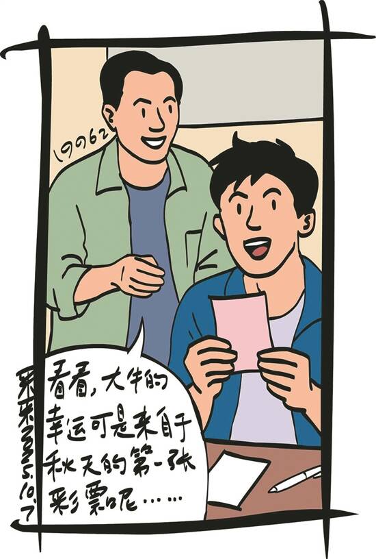 插图:采采 别人都喝秋天的第一杯奶茶、吃秋天的第一块蛋糕,大牛却说,他要买秋天的第一张彩票。 彩票站的老张笑呵呵地说:“大牛,你可真会琢磨。你这口号要是传出去,我这彩票店说不定人气更火热。”大牛说:“谁让我既不喜欢喝奶茶,也不喜欢吃蛋糕,就喜欢来你这里买彩票呢!” 老张乐了,冲店里其他彩民说:“大伙听见了吗?回去记得都和你们的朋友说一声,来我这买秋天的第一张彩票啊!” 大伙笑哈哈地应着,心里却也清楚:喜欢买彩票的,绝不会错过秋天的第一张彩票;不喜欢买彩票的,你拽着他来,花几块钱他也舍不得。 其实大牛说这话时,也没真当回事,就是随口一乐。哪想到开奖的时候,竟然中奖了。虽然就1000多元,但对大牛来说,却是从来没有中过的“巨款”了。 老张瞧着大牛的高兴样,故意说:“大牛,这么幸运,得请客啊!”大伙也跟着起哄,说:“看看,大牛的幸运可是来自于秋天的第一张彩票呢!”大牛听了,也来劲了,硬要请大家喝秋天的第一杯奶茶。大伙哈哈笑着说:“没想到,跟着大牛一起买了秋天的第一张彩票,也没错过秋天的第一杯奶茶呢!”(蓝雪冰儿)