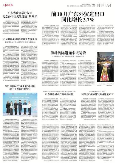 羊城晚报讯 记者严艺文、通讯员广交投报道:11月12日12时30分,广南快速路(含收费段海珠湾隧道和免费段连接线南段工程)通车试运营。广南快速路是省高速公路网加密联络线的第39联、“广州、深