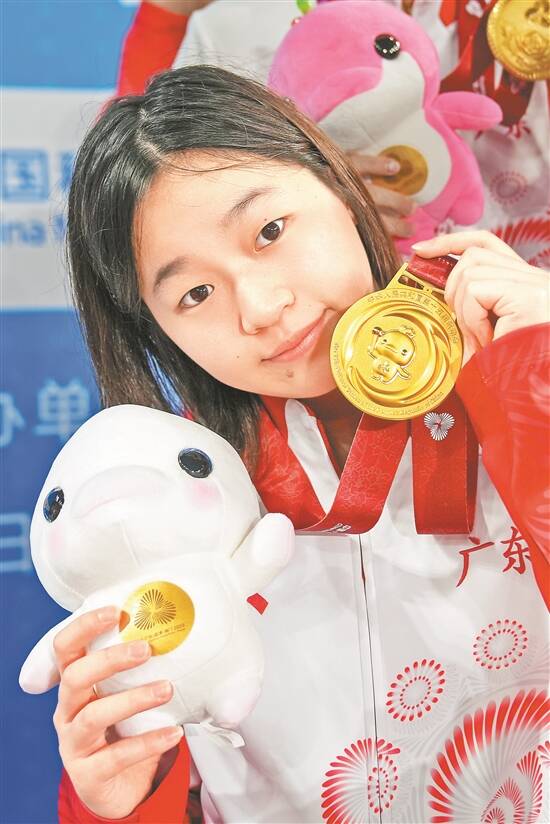 11月2日晚,由陈艺文、全红婵领衔的广东队夺得跳水女子团体冠军,成功卫冕。图为全红婵向观众展示金牌 羊城晚报记者 梁喻 摄 |
