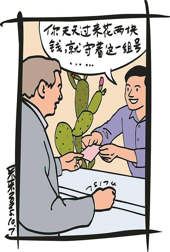 插图:采采 老孙有个习惯,每天午觉睡醒,总会下楼去小区大门一侧的彩票店,花2元钱买一张彩票,而且每天都买同一组固定号码,风雨无阻,至今已坚持了12个年头。 这家彩票店的店主姓高,50多岁,开这店也正好12年。老孙的第一张彩票就是在这儿买的,打那以后就没换过地方。要是买完彩票店里没别的客人,他就跟老高聊会儿天。久而久之,老孙成了店里的忠实彩民,两人也处成了无话不谈的老朋友。 有一回,老高给老孙打好彩票,递过去时笑着打趣:“你天天来花2元钱,就守着这一组号,我瞅着跟‘守株待兔’似的。” 老孙接过彩票,仔细折好塞进上衣内口袋,才慢悠悠地说:“你这话也没说错,我用这种‘守株待兔’的方法买彩票,一是省事,二是给自己添点盼头。你想啊,我退休了,一天到晚也没别的事,每天买张彩票攥在手里,心里就跟揣了颗糖似的。虽说不吃,可知道有这么个甜滋味在,一天都是好心情呢。” (汪小弟)