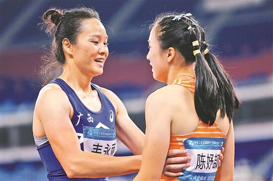 韦永丽笑着张开双臂,与年轻冠军陈妤颉拥抱 新华社发 |