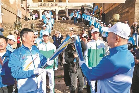 火炬手在梅州市梅县区松口镇“修旧如旧”的历史建筑前进行火炬交接 |