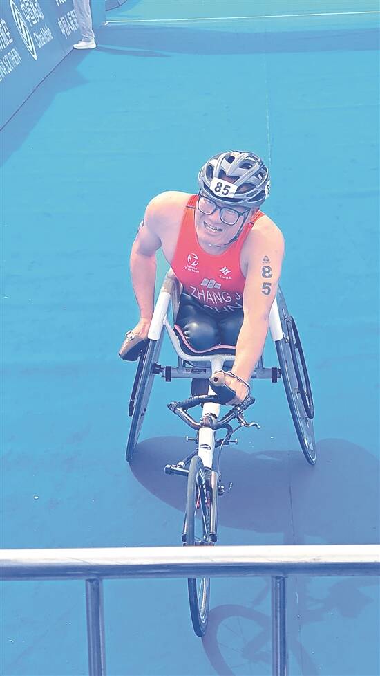文/图 羊城晚报记者 柳卓楠 【开栏语】 全国第十二届残疾人运动会暨第九届特殊奥林匹克运动会将于12月8日在广州开幕,全国各地的残疾人运动员齐聚大湾区,追逐体育梦想。即日起,《羊城晚报》开设《逐梦残特奥 湾区追梦人》栏目,记者将深入残特奥会赛场,记录和讲述残疾人运动员的逐梦故事。 把轮椅当“跑鞋”、跑过90多场马拉松后,44岁的张健,在全国第十二届残疾人运动会暨第九届特殊奥林匹克运动会(以下简称“残特奥会”)迎来了他的首个“铁人三项”比赛。 11月27日,残特奥会铁人三项比赛在肇庆开赛,这是我国首次设立残疾人铁人三项比赛,也是残特奥会历史上首次设立。在134名参赛的残疾人运动员中,张健是年龄最大的那个。他是马拉松圈内知名的轮椅跑者,这也是他的首个铁三比赛。44岁的他说:“永远不要给自己设限,人生无限可能”。 轮椅成为他的跑鞋 爽朗、豁达,这是记者第一次见到张健时的直观感受。今年4月,记者来到广州市残疾人体育运动中心,探营广东省残疾人铁人三项队训练。彼时,他刚刚完成一场750米游泳、20公里自行车、5公里跑步的训练。坐在轮椅上,面对围成一圈的记者,张健爽朗地讲述着自己的人生故事。 张健出生于山东临沂,3岁时因为一场疾病导致双腿无法行走,后来经过5次手术,依然无法治愈,只能以轮椅代步。初中时,张健的学习成绩一塌糊涂。“直到有一天我看到了一句话:人生如同马拉松,你是你最大的阻力。这句话如同闪电一样击中了我,让我重新审视反思自己。”张健说。 从那天起,张健的人生开始发生改变。他认真学习,勇敢地回答老师的问题,成绩也越来越好。后来,他考上了广州的一所大学,学习商务英语专业,并成为校园广播站的播音员。毕业后,他留在广州工作,2019年与朋友合伙创业,经营生态有机农场至今。 跑过90多场马拉松 张健和马拉松的缘分始于2014年。那年,他突然萌生了一个想法:“我能不能坐着轮椅完成一场自己的马拉松?”带着这个信念,他开始训练。 “最开始,我推着轮椅前行两三公里就累得气喘吁吁,特别想放弃。但一想起我的人生格言,我就又重新燃起斗志。”从5公里、10公里、20公里再到42公里,张健做到了。2014年年底,他完成了人生中的第一个马拉松——珠海马拉松。 “其实人生就是一场马拉松,获胜的关键不在于瞬间的爆发,而在于坚持。”这份坚持的力量,也一直改变着张健的人生轨迹。从2014年至今,10余年里,张健把轮椅当跑鞋,已经完成了90多场马拉松。他还组建了梦想无障碍跑团,通过奔跑来倡导公众场所的无障碍出行。 张健的微信名称是“轮椅先生”,他的人生故事也影响着许多轮椅上的残疾人。“我就是因为健哥才走出家门,是他把我引入马拉松这条路上的。如果他参加残特奥会,我会为他加油!”在不久前的一次采访中,一位来自福建的轮椅马拉松爱好者王璟向记者说道。 王璟的期待成真了。在11月27日的残特奥会铁人三项比赛现场,大家如愿见到了轮椅先生张健。这次,他突破自我,开启了人生的第一场“铁人三项”比赛。 挑战“铁人三项” 2024年5月,张健加入刚刚组建的广东省残疾人铁人三项队,备战2025年残特奥会铁人三项比赛。这是中国首次设立残疾人铁人三项比赛。对于很多运动员来说,大家都是第一次接触铁三。 残特奥会铁人三项比赛包括:游泳750米、自行车20公里、跑步5公里,相当于健全人铁人三项的半程标准。赛事按运动员残疾类型和程度分为10个运动级别,例如轮椅组、听力障碍组、视力障碍组等。张健属于PTWC1组,这一级别是重度残疾人轮椅使用者,他们除了750米的游泳外,在自行车赛道需使用倚靠式手摇三轮车,跑步赛段使用竞速轮椅。 对于张健来说,这三项比赛都是从零开始:没接触过竞速轮椅,没玩过手动自行车,还是个旱鸭子。44岁的年龄,也不占优势。但这些从来不是张健的障碍。“你的对手不是别人,只是你自己。”在一年多的训练中,张健学会了游泳,可以自如操作着竞速轮椅和手动自行车。在这当中,他经历了无数次摔倒、呛水,从没有放弃。 2025年11月27日这天,广东肇庆新区砚阳湖公园,张健如约出现在残特奥会铁人三项比赛现场。这一天,记者也在现场等待着这位44岁的“铁三勇士”。 鸣枪开赛!率先比拼的是750米的游泳,张健在砚阳湖的波光粼粼中破浪前行。随后,他在运动助理吴镇轩的协助下,坐上手摇三轮车、开启20公里骑行,然后再转换竞速轮椅,完成最后5公里的冲刺。 1小时15分31秒,冲刺过终点后,竞速轮椅上的张健汗如雨下,他高高举起握拳的双手欢呼。他做到了,完成了自己的第一场铁人三项比赛,并夺得了一枚铜牌。 赛后,在接受羊城晚报记者专访时,他说:“特别感谢教练和后勤团队的付出,还有家人的支持。这次对自己的表现很满意,游泳落后了一点,我还可以更好!永远不要给自己的人生设限,我还要挑战自己。这些仅仅是一个开始,希望中国残疾人铁三登上世界舞台!”