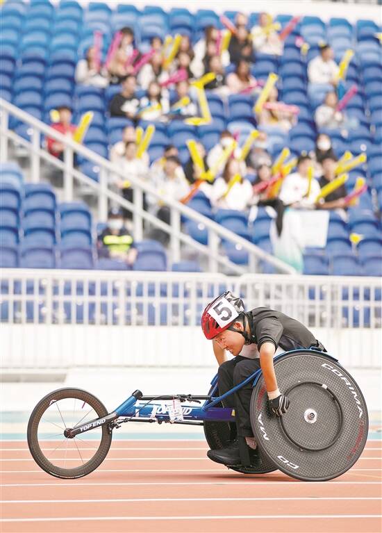 10日,残特奥会田径项目进入赛程第二日,广东选手杨义飞、梁燕芬、钟志强等分别斩获金牌。图为女子400米T52级决赛现场 羊城晚报记者 黄城栋 摄