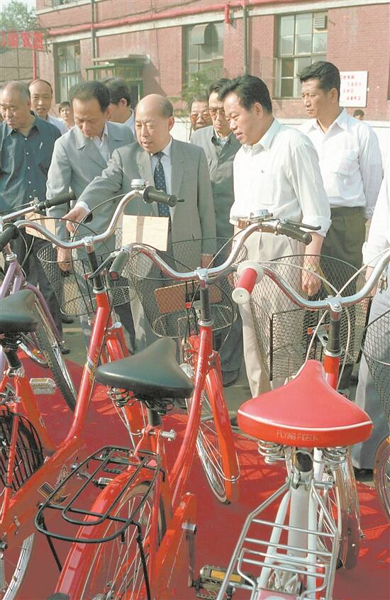 1990年6月3日,王丙乾同志在天津自行车厂考察 新华社发 |