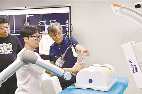 冯前进教授指导学生操作智能手术机器人系统 |