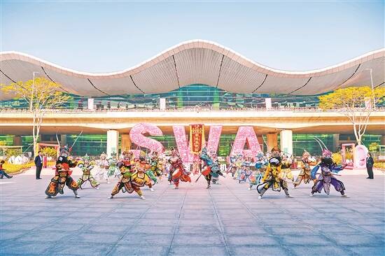 24日,揭阳潮汕国际机场举办活动庆祝其跻身“千万级机场”行列。图为英歌队在庆祝活动上表演 通讯员供图 |
