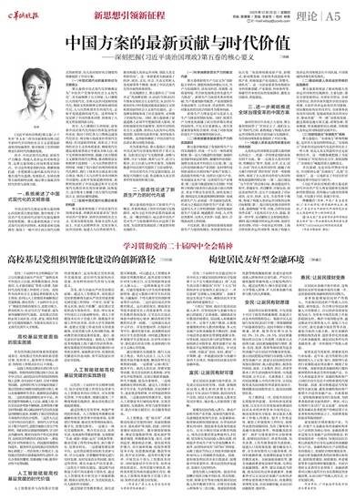 □周峰 《习近平谈治国理政》第五卷(以下简称“第五卷”)作为全面系统反映习近平新时代中国特色社会主义思想最新成果的权威著作,集中展现了党的创新理论在新时代的蓬勃发展。 其中,中国式现