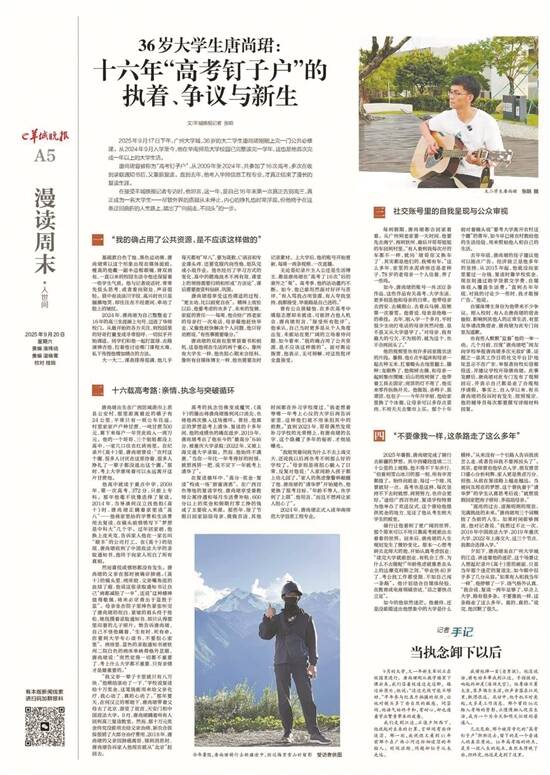 羊城晚报记者 张晗 王隽杰 这一年,我们共同屏住呼吸,感受时间的“加速”。 技术迭代的浪潮不断冲刷着感官,舆论变化的节奏掩盖琐碎的日常,生活仿佛被拆解成一段段可以被量化、被统计、被预测的时间,人被裹挟在算法的洪流中,步履匆匆。 但在《人世间》栏目的报道里,我们常常遇见另一种节奏。 在这里,时间并不总是向前飞奔。它会停驻,让一个55岁的人重新走进校园,让一个70岁的农妇在自家屋里铺开纸张;它会被拉得很长,长到需要用16年反复完成一次考试,或者用两年多时间等待一份迟来的判决;它也会在某个瞬间突然凝固,比如纵身一跃的那一秒,比如送别一只宠物的那一刻。它还会在某位近乎全盲的异国老人眼中绽放光芒。 在一个个看似普通的生命现场,总有人正在重启人生、负重前行、照亮他人。这些故事无关宏大的叙事,却关乎每一个具体的人如何度过他们的日子。关乎人们如何在纷繁复杂的时代安放自己,又如何在充满不确定性的世界里,努力把握生活的方向。 这一年,我们一次次看见,并记住了他们。 重启:在路上,永不晚 在人生的中途,选择一条未曾设想的道路,并不总是源于清晰的规划。更多时候,它来自某个不经意的瞬间,一次回望、一点不甘,或一声来自内心的提醒。 2025年秋天,55岁的张计玲毕业了,那天阳光很好。 她穿着学士服,小跑着靠近镜头,露出微白的鬓角。那是一张并不刻意摆拍的照片,却在网络上被反复转发。 很多年前,张计玲站在高考考场外,成绩并不理想,此后生活被推着向前,遗憾被藏进岁月褶皱里。直到陪儿子读书时,她重新翻开课本,那种久违的熟悉感,让她开始认真考虑一件曾以为已经错过的事。 2019年,张计玲开始备考。两年后,她以高出分数线45分的成绩考入山西工商学院学前教育专业。大学四年里,她通过了英语四级,考取了教师资格证,还尝试了研究生考试。 毕业那天,她在操场上,完成了那场迟到多年的奔跑。 广西桂林石塘镇,肖大妹的“重启”,是在一台缝纫机前。 2016年,她因病停下转了20年的豆磨子。日子空出来,一时无处安放。在女儿的鼓励下,她拿起纸笔,先是画画,画花草虫鸟,画记忆中的亲人。后来,她开始写字。写童年时的求学路、青年时的劳作,也写她与丈夫一起做豆腐的20年。家里那台老式缝纫机被取下缝纫头,铺上一块木板,成了她的书桌。纸张一页页摊开,字迹一笔一画落下。 去年11月,她在上海一场文学节的领奖台上发言,浓重的乡音漫过台下的寂静。人们在仔细地听,听她讲那些被认真写下的日子。 在郑州,65岁的李冬菊把“重启”写进了车轮碾过的轨迹里。 她经历过婚姻破裂、下岗失业,在很长一段时间里被抑郁困住。2013年冬天,一个骑行队从身边掠过,她忽然意识到,自己想要走出去。 从短途骑行到远行,靠着退休金和仅会的四句英语,李冬菊骑行穿越三大洲、16个国家。夜晚,她在陌生城市的街头找落脚的地方,白天,她迎着风继续上路。 在深圳,52岁的杨兴凤的“重启”,藏在有规律响起的键盘声里。 她是单亲妈妈,也曾是在工厂与城市边缘辗转的打工者。 14岁手抄《红楼梦》,17 岁发表诗作,18 岁想学三毛去“流浪”,却被生活一次次拽了回来。如今,她在零碎的生活间隙坚持阅读和写作,文学像一条隐秘的河流,贯穿了她的人生。在网络平台,杨兴凤已发表了上千篇作品,在被生计磨蚀的岁月里,她重新拾起了年少时的文学梦。每天,她都会打开文档,敲下新的文字。 他们在不同的年龄、不同的人生站点,重新启程。肖大妹说:“写作就像春天种下的瓜,它从不问现在是不是太晚。”原来,春天不只眷顾青葱的嫩芽,还从未拒绝任何一颗想要再次发芽的心。在路上,永不晚。 承重:生命的韧性与尊严 生活的重量,有时是具体的,譬如百斤货物压在肩头;有时是无形的,譬如漫长等待压在心头。那些选择扛起重量的人,那些在日复一日的坚持中向前的人,定义着生命的韧性与尊严。 在广州的楼梯间,30岁的扛楼工阿文正背着一个高近两米、重逾百斤的柜子。每上一级台阶,都留下一个潮湿的脚印。 他曾是部队尖兵,退伍后辗转数行,最终在扛楼中找到了踏实。有人在视频里替他惋惜,他却回应:“三百六十行,行行都要有人做。”一句话让他走红。但阿文很清醒,他知道这不是一份可以长期依赖的工作。身体在消耗,但在当下,他选择先把生活扛起。 对于胡心瑶来说,生命本身就是不可承受之重。 今年22岁的她,已经记不清自己进了几次ICU。14岁那年,胡心瑶被确诊为lgA血管炎(又称“过敏性紫癜”),今年3月,她进一步被确诊为ANCA血管炎,病魔缠身,求生艰难。 在最难熬的时候,是陌生人的善意托举了胡心瑶,为了将爱心传递下去,她希望能成立一个“病友之家”,将自己的经历分享出去,鼓舞更多人努力地生活下去。 在北京,Papi妈妈李依涵(化名)承受着另一种重量。 2022年9月,陪伴她13年的小狗Papi在小区遛弯时被毒杀,同一天,小区里共有11只狗狗中毒,9只死亡。 她辞去工作,自学法律,联合其他受害犬主提起诉讼。三年多时间里,她的生活几乎围绕着案件展开。等待、补充材料、面对质疑,也面对情绪反复的自己。终于,在历经9次延审之后,一审宣判,被告人因投放危险物质罪获刑4年。但对于李依涵来说,终审没有到来,她仍在持续关注案件的最新进展。 在路上行走的重量,则落在74岁的郑镇炎脚下。 2024年10月,他