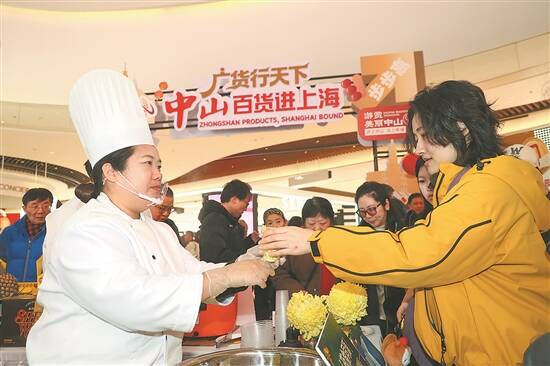 “广货行天下·中山百货进上海”活动中,可食用糖芯菊吸引不少上海市民品尝 羊城晚报记者 刘畅 摄 “广货行天下·中山百货进上海”拉开帷幕 粤沪百年商脉 再度谱写新篇 详见A2 “广货行天下”春季行动服装专场促销活动启动 科技赋能时尚 非遗“穿”进日常 详见A3