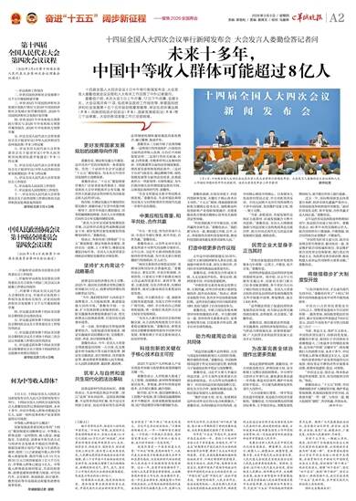 3月4日,十四届全国人大四次会议新闻发布会在人民大会堂新闻发布厅举行。十四届全国人大四次会议新闻发言人娄勤俭回答记者提问时提到,未来十多年,中国中等收入群体可能超过8亿人,是新一轮科技革命和产业变