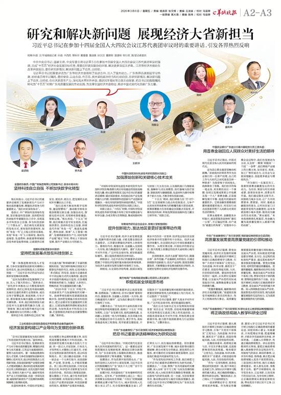 统筹/孙晶 文/羊城晚报记者 孙晶 丰西西 黎秋玲 戴曼曼 詹淑真 扶贝贝 董鹏程 莫谨榕 程行欢 图/受访者提供 中共中央总书记、国家主席、中央军委主席习近平5日在参加十四届全国人大四次会议江苏代表团审议时强调,完成“十五五”经济社会发展目标任务,需要应对更加复杂的环境、解决更多深层次矛盾。江苏等经济大省处在改革开放前沿,要在研究新情况、解决新问题上下功夫、出经验。 习近平总书记的重要讲话为广东等经济大省指明了前进方向、注入了强大动力。广东各界迅速掀起学习热潮,纷纷表示将牢记嘱托、勇担使命,以走在前、作示范、挑大梁的政治担当和行动自觉,在研究新情况、解决新问题上下功夫、出经验,在壮大新质生产力、深化高水平对外开放、增进民生福祉等方面主动探索,把总书记的殷殷嘱托转化为“十五五”时期广东高质量发展的生动实践,为支撑全国经济大盘稳定、推进中国式现代化贡献广东力量。 全国政协委员、中国广核集团有限公司党委书记、董事长杨长利: 坚持科技自立自强 不断加快数字化转型 杨长利表示,习近平总书记的重要讲话阐明了发展新质生产力对于推动高质量发展、增强经济竞争力的重要意义,“我们对此深有体会”。 他表示,中广核始终坚持绿色发展,坚定推进科技创新,坚持把科技的命脉牢牢掌握在自己手中,实现高水平科技自立自强,争当科技创新“三个排头兵”。我们将攻关更高效的发电方式、更有效的资源利用,加快“华龙一号”2.0版示范项目落地,布局“华龙一号”3.0版研发,推动先进堆型、先进燃料、新能源等领域前沿技术研发取得突破,让能源供应更安全、更经济、更自主,把发展的主动权牢牢攥在自己手里。 “我们还将不断加快数字化转型,建设智慧电厂,推动数字核电全链条数据互联互通,加强自动化、智能化技术应用,实现核电智能建造、智能运维。”杨长利说,“十五五”时期,我们将重点坚守安全底线,扛起保供责任,坚持科技自立自强,持续迭代升级“华龙一号”,推进先进堆型、燃料创新,探索“人工智能+核能”,发展核能新质生产力,同时发挥产业链“链主”作用,带动上下游协同发展,提升产业链自主可控能力。 佳都科技集团董事长陈娇: 坚持把发展基点放在科技创新上 “要一体推进教育科技人才发展,力争在加强原始创新和关键核心技术攻关、抢占科技制高点上实现新突破……”习近平总书记的这句话让陈娇深受触动和鼓舞。 “这也为佳都科技发展指明了方向,注入了强大的信心。”陈娇表示,“依托多年来推动AI大模型落地的深厚积淀,我们已率先发布面向城轨及城市交通的多款行业智能体,成功应用于智慧巡查、客流预测、行车计划、票务稽查及城市道路AI信控等关键场景。未来,我们将持续加大前沿技术与交通场景的融合力度,让‘智能体’真正成为提升城市运行效率、赋能美好出行的核心引擎。” 陈娇还介绍,佳都科技已经在“城市交通大脑”等领域积累了丰富的数据和经验,“我们将积极响应国家关于数智化升级的号召,利用AI技术助力‘多式联运’的攻坚,促进大交通体系中不同运输方式的无缝衔接,通过技术手段提升路网运行监控、应急调度等智能体的能力,为建设‘人享其行、物畅其流’的交通强国贡献力量。” “2026年是‘十五五’开局之年,也是新质生产力加速释放的关键一年。我将带领佳都科技紧跟国家战略步伐,坚持把发展基点放在科技创新上,把主业锚定在交通强国的主航道上,以更加饱满的热情和更加务实的态度,为加快高水平科技自立自强、打造智能经济新形态贡献智慧和力量。”陈娇说。 工业和信息化部信息通信经济专家委员会委员盘和林: 经济发展要构建以产业导向为支撑的创新体系 “总书记高屋建瓴地为我们指明了科技创新的发展方向。”盘和林说。 习近平总书记指出,发展新质生产力对于推动高质量发展、增强经济竞争力至关重要,江苏这方面基础较好,要努力走在前列。要一体推进教育科技人才发展,力争在加强原始创新和关键核心技术攻关、抢占科技制高点上实现新突破,在促进创新链产业链资金链人才链深度融合、推动科技成果高效转化应用上探索新途径,在优化提升传统产业、培育壮大新兴产业、超前布局未来产业上开创新局面,在进一步深化改革、破除制约新质生产力发展的体制机制障碍上取得新成果。 在盘和林看来,中国经济发展已经从规模主导过渡到质量主导,而实现高质量发展离不开科技创新。科技创新的发展方向重点包括几个方面:其一是以人才促创新,只有在人才培养和人才激励上打通关节,才能充分发挥创新者的积极性,抢占科技制高点。其二是以融合促创新,不是一家企业一个人单打独斗,而是创新链、产业链、资金链、人才链深度融合。其三是以转化促创新,只有完成转化应用,科学技术才能转变为实实在在的价值。其四是以制度促创新,要从激励上下功夫,减少技术研发到应用的障碍,实现高效应用转化。其五是以产业需求促创新,科技创新要有的放矢,要围绕产业需求来推进。 中国科学院深圳先进技术研究院院长刘陈立: 加强原始创新和关键核心技术攻关 “中国科学院深圳先进技术研究院作为中国科学院在粤港澳大湾区布局建设的国家战略科技力量,将认真贯彻落实习近平总书记的重要讲