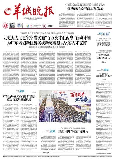 中共广东省委主管、主办 羊城晚报社出版 1957年10月1日创刊 2026年3月16日 丙午年正月廿八 星期一 责编/吴大海 美编/肖莎 校对/姚毅