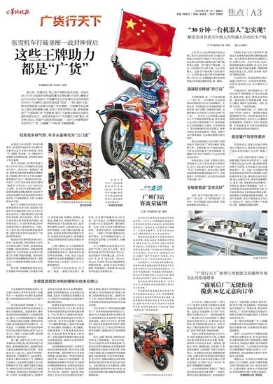 羊城晚报记者 陈卓栋 张闻 连日来,“张雪机车”线上线下收获空前关注度。当地时间3月29日结束的世界超级摩托车锦标赛(WSBK)葡萄牙站WorldSSP组别中,中国摩托车企业张雪机车自主研发的820RR-RS赛车以绝对优势包揽“双冠”,一举打破杜卡迪、雅马哈等欧美日品牌长达数十年的垄断。中国摩托车品牌站上国际顶级赛事之巅,证明了坚持梦想的力量,更再度彰显了“中国制造”向“中国智造”跃迁,已具备与国际巨头掰手腕的体系化实力。冠军战车诞生于“中国摩托之都”重庆,却非单打独斗,而是产业链协同的结晶——其不少关键零部件及技术为“广货”,闪耀着“广东制造”的璀璨身影。 冠军战车排气管、车手头盔等均为“江门造” 记者近日采访获悉,WSBK赛事中,张雪机车820RR-RS赛车所用配件以及车手使用的装备,均有“江门制造”的身影。江门摩托车产业集群完善的供应链,为该赛车提供了坚实支撑。 其中,820RR-RS赛车的排气管(消声器)由江门市瑞跃实业有限公司生产。该公司是一家集设计、制造、销售各类体育休闲摩托车的燃油箱、挡泥板、排气管(消声器)及碳纤维等系列产品于一体的综合性企业,打造出了在行业内有较高知名度的“疯老头”(CRAZY OLD MAN)自主品牌。公司为10余家国内主机厂提供优质稳定的配套服务,也是多个国际知名摩托车改装品牌的长期合作伙伴,产品畅销欧美、日韩、东南亚和国内市场。 据江门市瑞跃实业有限公司总经理助理陈化柱介绍,820RR-RS赛车车型顶配的排气管(消声器)分段分别采用了碳纤维材料、航空级铝合金材料、钛合金材料。其中,钛合金材料在面对改款消声器时,因形状变化大,在成形和焊接过程中的要求非常高、难度非常大。同时,为了提升钛合金的质感和耐候性能,瑞跃实业还对其表面进行了特殊的防钛处理。 820RR-RS赛车使用的819CC直列三缸发动机,为张雪机车100%自主研发,融合了欧洲三缸发动机设计精髓,同时在轻量化、高转速和赛道适应性上实现突破,标志着从“跟跑”向“并跑”的技术跨越。该发动机缸体采用的电镀陶瓷缸体技术,来源于江门市朝扬精密制造有限公司的支持。 据介绍,电镀陶瓷缸体技术是在普通缸体的表面镀上硅镍复合镀层,兼具耐高温、抗摩损、耐腐蚀,强度高,摩擦力小,重量轻等特点。这些特性有助于发动机轻量化,提升整车操控灵活性,同时减少动力运转中的损耗,让动力输出更直接、更强劲,也使发动机即便在赛道高负荷、高强度的持续运转中,依然能保持稳定的性能表现与超长的使用寿命。 记者了解到,江门市朝扬精密制造有限公司在2008年开始研发电镀陶瓷缸体技术,最终成功打破国外技术垄断。目前,该公司是国内摩托车发动机电镀陶瓷气缸技术的领军企业,其技术广泛应用于大排量摩托车。 冠军车手的头盔也是“江门造”。据悉,一骑绝尘的瓦伦丁·德比斯,在比赛中佩戴的是LS2头盔。该产品是江门市鹏程头盔有限公司旗下自主高端品牌。赛后排位甫一公布,LS2头盔官方微博发文祝贺:“恭喜张雪机车,也恭喜我们自己。一同登上WSBK葡萄牙分站冠军舞台。以中国制造为底气,以世界冠军为答案,让中国锋芒,闪耀世界赛道。” 江门市鹏程头盔有限公司于2007年创立LS2自主品牌。其过硬品质通过FIM等全球严苛认证,成为顶级车手的信赖之选。近年来,LS2头盔是MotoGP、Moto2、Moto3、WSBK等国际顶级赛事长期赞助装备。2022年北京冬奥会期间,其还被瑞士、奥地利、罗马尼亚雪车队选用为参赛用盔。 支撑直道极致冲刺的硬核科技来自佛山 在这场摩托车的极限竞技中,来自佛山的核心零部件也发挥了关键作用——820RR-RS赛车发动机搭载了季华实验室自研的TiAl合金气门。 作为发动机的“呼吸阀门”,气门的性能直接决定赛车发动机的动力输出与极限转速。顶级赛事中,赛车发动机需长时间维持上万转超高转速,排气门工作温度超800℃,普通气门极易出现动力疲软、烧蚀变形等问题,成为赛场胜负的关键卡点。为攻克这一行业难题,季华实验室材料科学与技术研究部潜心研发TiAl合金气门,凭借三大核心优势,成为赛场背后的“隐形冠军”。 据了解,这款TiAl合金气门由金属间化合物打造,和国外同类产品相比,兼具极致轻量化、超强耐高温与超高运转精度的综合优势。其密度仅为4.0g/cm^3,远低于传统钢、镍基材质,大幅降低气门运动惯性,从根本上解决高转速下气门弹跳的行业痛点,让发动机在极限工况下保持精准开合节奏,进排气效率显著提升;材料可从容应对800℃以上极端工作温度,高温环境下结构稳定不烧蚀、不变形,有效避免因气门故障引发的动力衰减;配合专业赛事调校,进排气时机精准无误,让发动机在高转速、高负荷下持续稳定高效输出动力,为赛车在弯道加速与直道冲刺中抢占绝对先机。 据季华实验室材料科学与技术研究部研究员李小兵介绍,轻量化带来的连锁优势成为性能突破的核心,TiAl合金气门相较传统材质,能让发动机极限转速每分钟提升1000转,同步优化进排气效率。“气门越轻惯性越小,进而让转速越高、响应越快、损耗越小、动力越顺,高转速基础上实现多系统联动优化,让发动机整体性能迈上新台阶。”这也是此次参赛赛车能在直道实现极致加速,最终以显著优势夺冠的关键原因。 这份赛场荣光的背后,是季华实验室从材料研发到工程应用的全链条技术突破。团队深