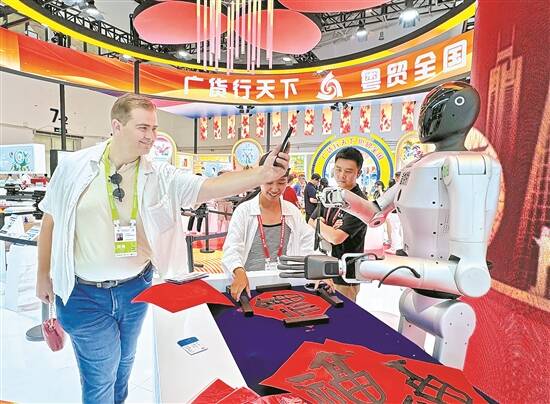 消博会广东馆内,机器人写福字,吸引外商打卡 羊城晚报记者 王丹阳 摄 |