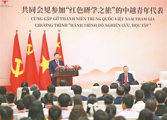 新华社电 4月15日上午,中共中央总书记、国家主席习近平在人民大会堂同来华进行国事访问的越共中央总书记、国家主席苏林共同会见参加“红色研学之旅”的中越青年代表。 习近平发表讲话,表示去年我和苏林总书记一道启动“红色研学之旅”项目,一年来,两国青年共同探寻中越友好的红色基因,感受中国式现代化的万千气象,在中国各地留下许多互学互鉴、相知相亲的生动故事。不久前,我收到越南河内国家大学外语附中等学校的同学们用中文写来的信,分享了参加“红色研学之旅”的深刻感悟,立志做中越友谊的传承者和传播者,我感到很欣慰。 习近平强调,青年是推动社会发展进步的有生力量,也是中越两党两国事业薪火相传的接棒人。我对大家提出三点希望:一是希望你们守望相助,让中越“同志加兄弟”的深厚情谊焕发青春光彩;二是希望你们挺膺担当,用青春的活力和创造力激荡起创新、开放、合作、共赢的澎湃春潮;三是希望你们胸怀天下,争做构建人类命运共同体的先锋队,为人类进步事业贡献青春力量。 苏林表示,“红色研学之旅”启动一年来,上千名越南青年沿着老一辈领导人足迹参访在中国的红色遗址,体悟两国的革命传统和深厚友谊。青年是越中两党两国关系的重要桥梁,希望两国青年进一步坚定理想信念,提高政治本领,掌握科学知识,深化对越中关系的认识,为各自国家发展和两国友好发挥重要作用。 参加“红色研学之旅”活动的越方200多名青年代表和中方100多名青年代表出席此次活动。两国青年对双方领导人发表的重要讲话报以热烈掌声。 “红色研学之旅”活动由习近平总书记、国家主席在2025年4月访问越南期间同苏林共同宣布,旨在鼓励两国青年沿着两国老一辈领导人的革命足迹,探寻中越友好的红色基因,为两国社会主义事业和构建具有战略意义的中越命运共同体凝聚青春力量。 蔡奇、王毅、尹力、王小洪等参加。