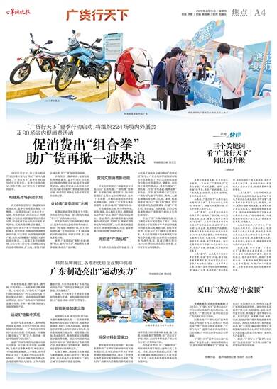 羊城晚报记者 扶贝贝 4月15日下午,白云国际机场T3航站楼出发大厅湾区广场内人潮涌动,“广货行天下”夏季行动启动仪式在这里举行。夏季行动亮点纷呈、精彩不断,为广货行天下奏响新的乐章。 构建拓市场长效机制 省工业和信息化厅二级巡视员庄乐从表示,夏季行动将重点落实三大维度。一是常态化toC(面向消费者)促销,聚焦摩托车、超高清显示、智能穿戴、日化用品、纺织服装等五大重点品类,联合电商平台与地市开展超40场活动,实现终端消费品全覆盖。二是发力toB(面向产业)产销对接,针对机器人、低空经济、生物医药等战略性新兴产业,以及服装、玩具等传统优势产业,组织20场覆盖产业链上下游的供需对接会。三是建立支持长效机制,出台专项工作方案,从制度层面支持企业对接活动、扩大线上销售、打造区域品牌,为“广货”提供坚强保障。 省商务厅一级调研员、交流处处长华彬透露称,夏季行动计划组织224场境内外展会及90场省内促消费活动。通过搭建高水准的展会平台,助力超4万家次广东企业开拓全球市场,将政策红利转化为企业的实实在在的订单。 让岭南“夏季甜蜜”出圈 夏季是岭南佳果的集中上市期。省农业农村厅将这一窗口期视为做强“粤字号”品牌的核心时点。 省农业农村厅总经济师郑志雄表示,夏季行动将以荔枝营销为突破口,联动广西、福建、海南等产区,在4月下旬举办第二十四届中国(广东)荔枝龙眼产销对接活动,深耕京津冀、长三角及东北市场。 此外,广东将探索“体育+农业+消费”模式,借力“粤BA”、粤超等本土赛事流量,推动农产品出圈。 激发文旅消费新动能 省文化和旅游厅二级巡视员东田提出以“文旅为媒、广货为核”的策略。在省级层面,将借势“5·19中国旅游日”及端午龙舟月等节点,发布“广东礼物”,并利用高德地图开辟专区精准引流。同时,广东文旅大篷车将横跨12省16城,将广货推向全国。 在全域联动方面,各市各展所长。深圳、珠海、汕头利用文博会、港澳旅展及海外推广活动,推动广货走向国际舞台。清远、梅州、潮州侧重非遗与国潮融合,将清远鸡、英德红茶、客家文创等转化为“网红尖货”。东莞、韶关则通过音乐节、赛事及景区嵌入,打造“跟着赛事/美景买好物”的消费场景。 将打造“广货机场” 作为此次启动仪式的东道主,白云机场正加速从交通枢纽向“消费枢纽”转型。广东省机场管理集团有限公司党委委员,广州白云国际机场股份有限公司党委书记、董事长、总经理王晓勇明确表示,将全力建设“广货机场”,打造“来粤必逛、离粤必购”新地标。目前,航站楼核心区已设立广货专区与老字号街区,华为、大疆及陶陶居等品牌已入驻。未来,机场将通过“航空+广货+文旅”模式,把过境流量转化为消费增量,打通“广货上机、全球速达”的快车道,让白云机场成为展示广东智造与岭南文化的全球展厅。 作为“广货”出海的硬核代表,江门摩托车也在现场进行了展示。活动现场展示了张雪机车车手夺冠时佩戴的同款头盔以及陶瓷气缸、铝轮等零部件,还展示了江门本地品牌摩托车。大长江集团旗下的豪爵摩托车导购员李阳建介绍,该品牌的水冷踏板车代表性机型,集成了德国博世(BOSCH)等国际顶尖供应商体系,主打安全性与高端配套。 统筹/孙晶 图/羊城晚报记者 张瑞柠 刘志勇