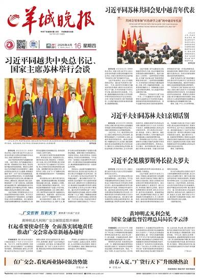 中共广东省委主管、主办 羊城晚报社出版 1957年10月1日创刊 2026年4月16日 丙午年二月廿九 星期四 责编/陆德洁 美编/肖莎 校对/张家梁 报