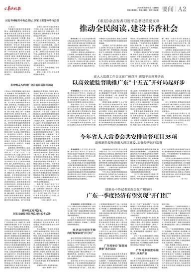 羊城晚报讯 4月15日,省人大监督工作会议在广州召开,《广东省人大常委会2026年度监督工作计划》正式发布。记者从会上获悉,今年省人大常委会将安排监督项目共35项。 为助推新阶段粤港澳大湾区建
