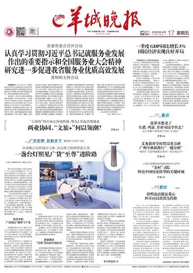 中共广东省委主管、主办 羊城晚报社出版 1957年10月1日创刊 2026年4月17日 丙午年三月初一 星期五 责编/陆德洁 美编/肖莎 校对/马曼婷 报料热线: