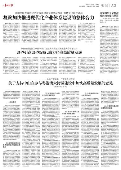 为深入实施《粤港澳大湾区发展规划纲要》,支持中山统筹推进深层次改革和高水平开放,紧密对接港澳积极参与粤港澳大湾区建设,加快推动高质量发展,在促进珠江口东西两岸融合发展上走在前、作表率,现提出如下意