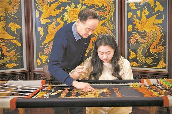 袁淑敏在父亲的指导下绣制作品 |