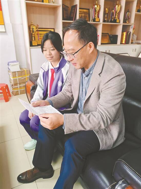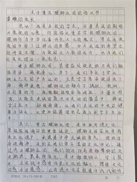 江紫睿将一封字迹工整、情真意切的《关于重启醒狮社团的倡议书》递到校长陆常波手中 受访者供图 |