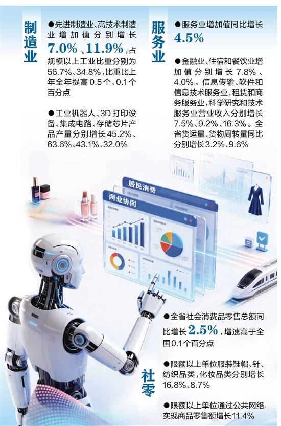 羊城晚报讯 记者陈泽云报道:4月21日,广东省统计局公布一季度广东经济运行数据。根据地区生产总值统一核算结果,一季度,广东实现地区生产总值34950.34亿元,按不变价格计算,同比增长4.6%。其中,第一产业增加值941.66亿元,增长3.9%;第二产业增加值12410.95亿元,增长4.7%;第三产业增加值21597.72亿元,增长4.5%。 一季度,全省规模以上工业增加值同比增长5.4%,增速比上年全年提高2.4个百分点。分行业看,计算机、通信和其他电子设备制造业,电气机械和器材制造业,电力、热力生产和供应业,专用设备制造业分别增长13.4%、4.9%、9.4%、9.1%,增速比上年全年提高6.3个、0.9个、9.3个、1.5个百分点;化学原料和化学制品制造业增长5.9%,石油、煤炭及其他燃料加工业增长7.6%。 农业生产总体平稳。一季度全省农林牧渔业总产值同比增长4.3%,蔬菜、园林水果、茶叶产量分别增长2.3%、4.9%、5.5%,生猪出栏增长10.8%。 一季度,固定资产投资同比增长0.2%,连续两个月保持正增长;扣除房地产开发投资,全省固定资产投资增长5.8%。大规模设备更新政策效应持续显现,设备工器具投资大幅增长42.3%。 分领域看,基础设施投资增长10.5%,连续两个月保持两位数增长,增速比上年全年提高18.7个百分点,其中,电力、热力生产和供应业投资增长12.0%,互联网和相关服务业投资增长524.0%。工业投资增长1.4%,增速提高15.8个百分点,其中计算机、通信和其他电子设备制造业投资增长43.5%。 一季度,全省居民消费价格指数(CPI)同比上涨0.5%,涨幅比上年全年扩大0.7个百分点。工业生产者出厂价格指数(PPI)同比下降1.2%,降幅比上年全年收窄0.3个百分点,居民收入持续增加。一季度,全省居民人均可支配收入16096元,同比名义增长4.4%,扣除价格因素,实际增长3.9%。按常住地分,城镇居民人均可支配收入19196元,同比增长3.9%,扣除价格因素,实际增长3.3%;农村居民人均可支配收入8473元,同比增长5.6%,扣除价格因素,实际增长5.9%。 广东省统计局指出,一季度,广东全省经济运行总体延续回升向好态势,开局良好。