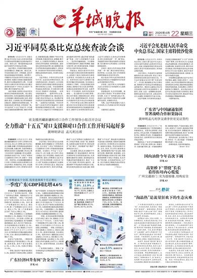 中共广东省委主管、主办 羊城晚报社出版 1957年10月1日创刊 30℃ 22℃ 2026年4月22日 星期三 丙午年三月初六 责编/冷爽