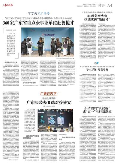 羊城晚报记者 张德钢 21日,“百万英才汇南粤”2026年N城联动春季招聘活动(山东大学专场)在山东大学中心校区举办。360家广东省重点企事业单位“组团”前来,携1.3万个优质岗位