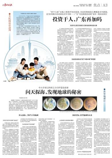 羊城晚报记者 陈亮 海啸离广东有多远?火星和地球有何关系?4月22日是第57个世界地球日,今年的主题为“珍爱自然资源,守护美丽中国”。在这个以守护地球为名的日子里,羊城晚报记者围绕