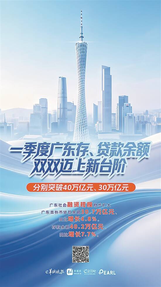 羊城晚报讯 记者戴曼曼报道:金融总量合理增长,存贷款余额迈上新台阶!4月23日,2026年一季度广东省金融运行形势新闻发布会上,广东一季度金融“成绩单”正式发布,今年以来,广东社会融资规模稳步扩大,存、贷款余额分别突破40万亿元、30万亿元,金融总量继续稳居全国第一。 存款“活化” 经济“动了起来” “金融总量增长与名义经济增长基本匹配。换言之,就是金融总量较好地满足了经济增长的需要,金融对实体经济的支持力度是稳固的。”中国人民银行广东省分行副行长张双长介绍,今年以来该行落实适度宽松的货币政策,发挥好货币政策工具总量和结构双重功能,社会融资条件处于宽松状态,金融总量增速较去年同期也有所加快,为广东经济高质量发展营造了适宜的货币金融环境。 数据显示,一季度末,广东社会融资规模存量同比增长6.9%;一季度,社会融资规模增量1.1万亿元;一季度末,广东本外币贷款余额30.7万亿元、同比增长4.8%。存款余额40.2万亿元、同比增长7.7%。其中,活期存款余额同比增长8.1%,快于各项存款增速,存款的“活化”表明,存量政策与增量政策的效果都在持续显现,有力地促进了消费和投资,激发了经济活力,让经济“动了起来”。 金融结构 不断优化 近年来,广东经济结构正向高质量发展领域升级换挡,同时随着金融市场发展和融资工具创新,实体经济融资模式发生了深刻变化,社会融资渠道也逐步向债券、股票等多种融资方式拓展,融资结构更趋多元。目前,直接融资占比已接近百分之四十,正发挥越来越重要的作用。 数据显示,1-3月,广东非金融企业债券、股票和地方政府债券等直接融资增加4117亿元、同比多增1301亿元,占广东社会融资规模增量的比重为36.8%、同比提升了10.9个百分点。银行贷款与债券、股权等直接融资渠道互相补充,对经营主体的支持作用明显增强。 另一方面,结构性货币政策工具的牵引带动作用持续显现。“年初,人民银行总行出台一揽子增量政策,结构性货币政策工具的利率下调、额度增加、使用范围扩大,带动金融机构加大对国民经济重大战略、重点领域和薄弱环节等领域的支持力度,这些领域的贷款增速均高于整体贷款增速,有力支持了经济转型、稳定投资、保障民生福祉。”张双长介绍,2月末,广东金融机构在金融“五篇大文章”,也就是科技金融、绿色金融、普惠金融、养老金融和数字金融,这五个领域的贷款余额合计13.2万亿元、同比增长11.5%,占各项贷款的比重近五成。其中,科技、绿色、普惠、养老产业、数字经济产业贷款分别同比增长13.6%、19.4%、8.4%、29.5%、13.9%。 其中,制造业贷款跑出了“加速度”。一季度末,制造业单位贷款余额4万亿元、同比增长13.7%,增速较上年同期明显加快,有力地满足了“制造业当家”重大战略的资金需求。 社会综合融资成本 保持低位运行 数据显示,3月广东金融机构新发放的贷款利率平均为3.06%,较上年同期低0.2个百分点。此外,人民银行广东省分行还推动各类金融机构向企业明确展示综合融资成本,包括贷款利率以及担保费等其他融资费用,既有效保障企业能够全面了解各项融资成本的具体情况,又可以通过市场化对比和选择,促进降低企业融资的综合成本。 人民银行广东省分行表示,下一步,将继续认真落实好人民银行总行和省委、省政府各项工作部署,聚焦加快金融强省建设目标,综合运用多种货币政策工具,推动金融资源更精准、更高效地流向重点领域和薄弱环节,有效满足实体经济融资需求,更好地支持广东经济高质量发展。