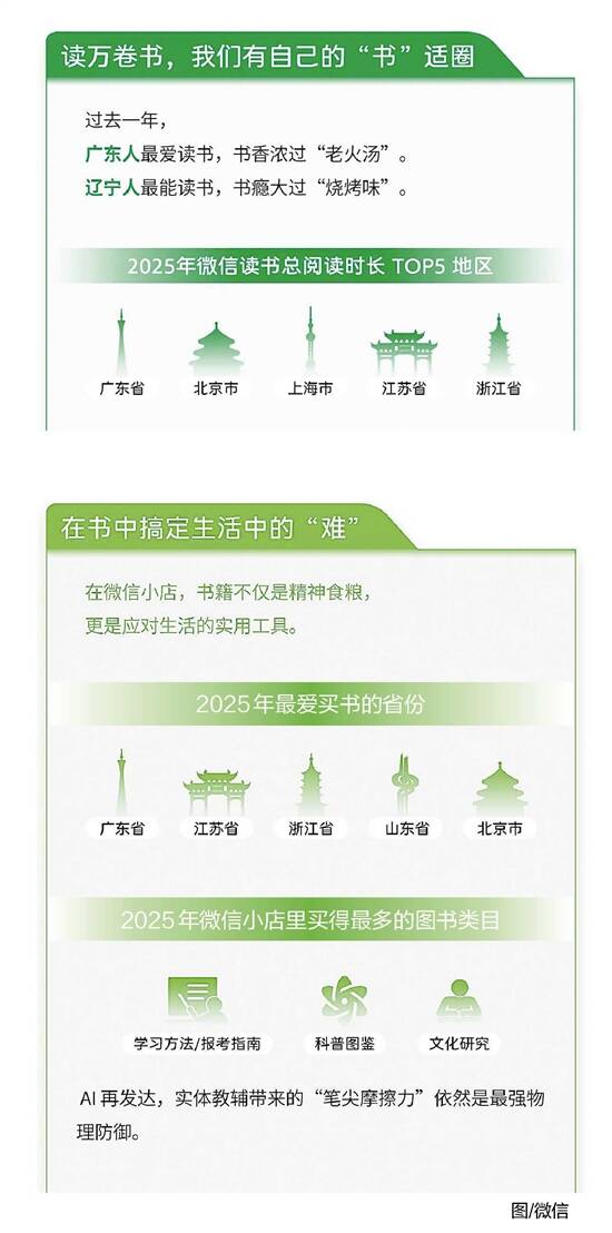 羊城晚报讯 记者王丹阳报道:4月23日是世界读书日。微信发布的《2026世界读书日微信开卷数据报告》显示,广东成为“阅读大省”。2025年,广东不仅在微信读书上全年总阅读时长领跑全国,也在微信小店“最爱买书的地区”排行中拔得头筹。 微信读书阅读数据显示,在AI盛行的2025年,经典作品展现出强大生命力。有885本书吸引了超10万用户,其中16本“国民级”作品阅读人数超百万。 在线上读书中,读者通过“划线”功能积极与文本对话,全年最热的10句话被“划”了145万次。例如,《蛤蟆先生去看心理医生》中关于“允许试错”的句子就引发了广泛共鸣。 此外,在微信上买书送书,也成为了不少人的新选择。微信小店数据显示,2025年,最爱买书的地区分别是广东、江苏、浙江、山东和北京。微信小店里最畅销的图书类目分别是学习方法/报考指南、科普图鉴、文化研究;从销量增速上看,文化休闲、育儿百科、学习方法/报考指南位居前列,可见,书籍不仅是精神食粮,更是应对生活的实用工具。 2025年,微信小店送出最多的图书类目分别是生活养生、社会心理学、养生。其中,送礼销量最多的图书是《每日晨读优美句子1月-12月(日历)国风插画》和《家庭健康管理全书》。