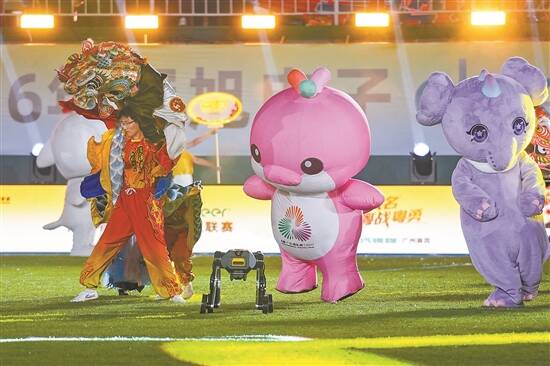 粤超开幕式上,“大湾鸡”、醒狮与机器狗等一同登场 羊城晚报记者 梁喻 摄 |