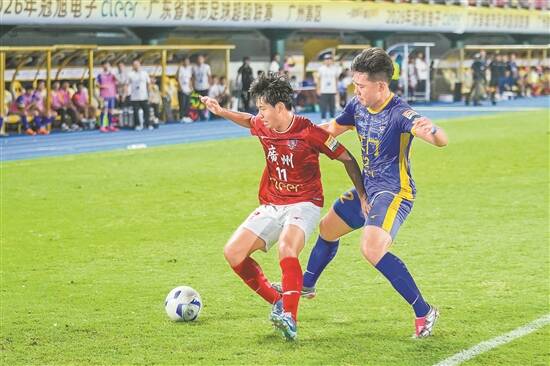 粤超揭幕战,广州队与江门队激烈拼抢 羊城晚报记者 梁喻 摄 |