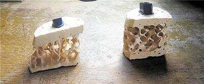 右为正常椎体,左为骨质疏松后出现压缩性骨折的椎体 图/羊城晚报记者 陈辉