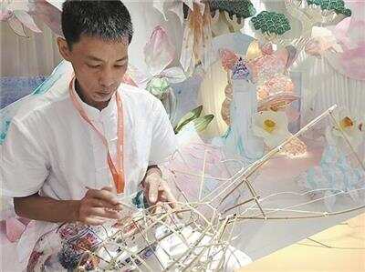 潘智江正在制作鱼灯