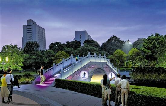 据介绍,在文华公园桥梁上设置了互动感应楼梯,当人迈步登梯而上时,通过感应系统实现楼梯亮度提升与变色的效果,而在无人的时候楼梯则自动降低亮度,减少能耗;在桥侧面以投影的方式,上演鹊桥相会的故事,渲染烂漫的氛围。此外,为增加七夕节日气氛,文华公园爱心形廊道灯饰及“鹊桥”试亮灯时间为2019年8月6日至8月8日(19:00-22:00)共三天晚上。