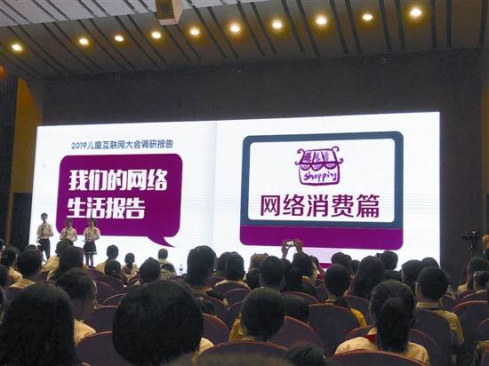 儿童调研员张诗钒、丁绍轩、王雪雯用PPT展示了对网络消费的调查报告,他们很有心地把问卷设计成了儿童版和家长版两种,儿童和家长有效问卷都是313份。