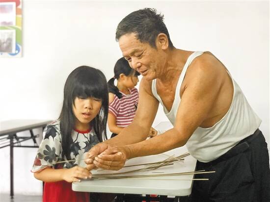 小朋友们领到各种材料后,在邓佰稳的指导下,开始制作起来。“先用六条竹篾,每条折成八个角。”据邓佰稳介绍,然后,将各个角全部扎起对折,就制成了禾碌灯。记者现场看到,经过邓佰稳耐心指点,在家长的帮助下,小朋友们基本上都学会了制作禾碌灯,而且还做得有模有样,受到稳伯的好评。