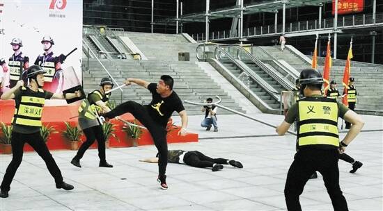 羊城晚报讯 记者郭起,通讯员任冠元、蒋磊、杨文涛报道:“快来人呀,有人抢手机……”看到有群众呼救求助,正在巡逻的4名身着“深圳义警”马甲的处突队员快速到场,利用携带的盾牌、钢叉、长棍等装备果断处置,成功制服嫌疑人,追回被抢财物……27日上午,在深圳会展中心北广场暴雨中出现的这一幕,并非真正的案件,而是福田警方模拟处置突发警情的场景,身手敏捷、快速制服歹徒的队员则是训练有素的“义警”。当天9时,福田街道举行“深圳义警”大巡逻大防控启动仪式,这标志着福田区试点建设的第一支5000人义警队伍正式成立。福田、福强、皇岗口岸派出所民警和义警队伍共计1000余人参加了启动仪式。