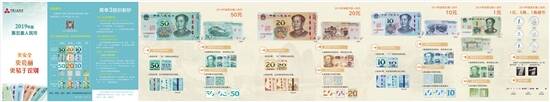 2019年版第五套人民币50元、20元、10元、1元纸币分别保持2005年版第五套人民币50元、20元、10元纸币和1999年版第五套人民币1元纸币规格、主图案、主色调、“中国人民银行”行名、国徽、盲文面额标记、汉语拼音行名、民族文字等要素不变,提高了票面色彩鲜亮度,优化了票面结构层次和效果,提升了整体防伪性能。新版纸币调整了正面毛泽东头像、装饰团花、横号码、背面主景和正面面额数字的样式,增加正面左侧装饰纹样,取消正面右侧凹印手感线和背面右下角局部图案,票面年号改为“2019年”。