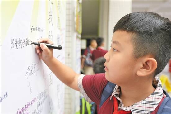 当天早上7时许,虽然下着大雨,珠海香洲区第十二小学的不少学生和家长伴随着《我和我的祖国》的旋律,手持国旗步入校门,开启“开学第一课”。今年六年级的高嘉威在学校的签名墙上,认真地写下了“祖国,我为您自豪!”他说:“这是我心底的真实想法,今年我也要更加努力。”