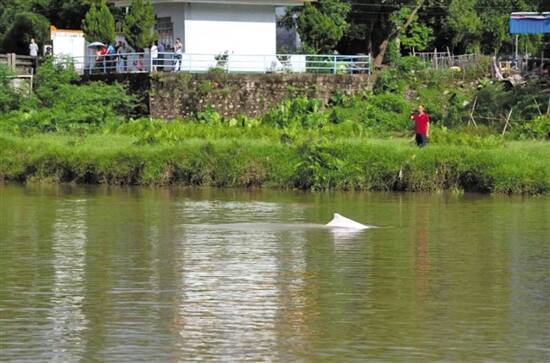 羊城晚报讯 记者陈卓栋,通讯员冯抗抗、谭耀广摄影报道:一头浑身白色的大鱼日前出现在江门台山市内河当中,村民发现后立即上报,原来是一头中华白海豚。记者2日获悉,一头中华白海豚日前误入台山端芬河塘底村河段,连日来江门中华白海豚省级自然保护区管理处人员施以考察、救护,但可惜在1日下午已不见其踪影,截至记者发稿时为止,情况仍未明了。据了解,这头中华白海豚最早在8月28日出现于台山端芬河塘底村河段,发现时经常浮出水面,露出其雪白的背鳍。据发现的村民回忆:“在河中动作挺活跃的,反应也大。”江门中华白海豚省级自然保护区管理处人员表示:“收到消息后,我们立刻赶到现场了解情况,通过观察这片内河流域包括上游下游具体情况,我们猜测这头‘迷路’的白海豚应该是从烽火角入海口进来的。”