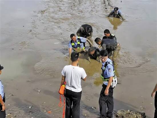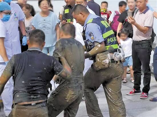 民警与辅警拉着自杀男子在淤泥中艰难爬行