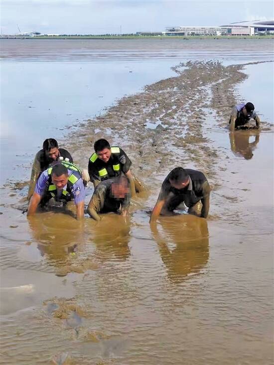 方正中介绍,他们下海时男子已经离岸100多米,由于退潮,他们脚下都是厚厚的淤泥,陈清良在前他在后,蹚着水和淤泥向男子靠近。“我高1.82米,刚下去的时候淤泥大概到小腿的位置,再往前走就到腰部了,加上还带着单警装备,走起来很吃力。”两人越走越累,后来发现爬行比这样蹚泥水走得要省力,于是两人干脆爬着前进。