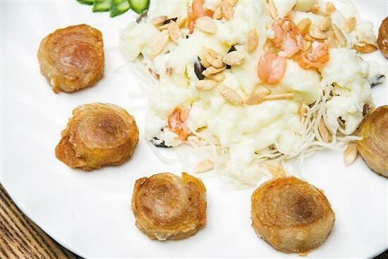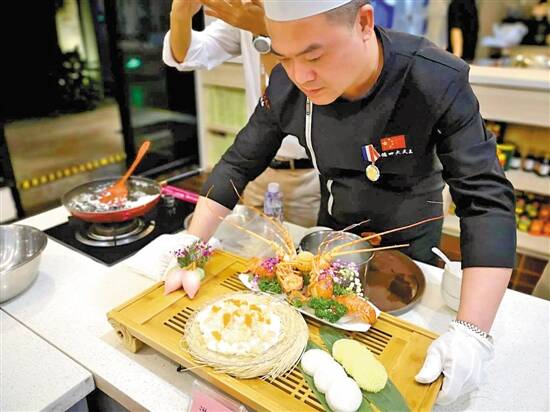 “蛋清和生粉是重要辅料,鲜虾仁和火腿丁带来丰富的味觉层次。”廖锡祥说,炒牛奶,考验厨师的耐性和对火候的精妙把握。牛奶蛋白对高温格外敏感,遇热极易变焦;一铲一堆,每一次旋转完结一道工序。9次旋转之后,牛奶成形。蟹子和榄仁突破牛奶的圆融,点亮意外惊喜。该菜式将牛奶与蛋清混合下锅软炒,使之凝固如白玉,口感香滑软嫩,外观色如白玉,嗅之奶香扑鼻。