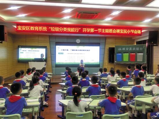 “玻璃窗、牙膏皮属于可回收物么?”“大棒骨属于可回收物还是不可回收物?”9月6日,宝安区宝民小学举行了一场别开生面的主题班会,内容是“垃圾分类我能行”。孩子们通过课堂上抢答、必答和判断题的环节,对垃圾分类的概念、意义、做法以及容易混淆的概念有了更深入的了解。最后还用粘贴板的形式,进行了对可回收、残余、有害和其他垃圾的分类实践。这样生动活泼的主题班会是让广大学生们对垃圾分类的一次认知和预热,该活动也是宝安教育系统“垃圾分类我能行”开学第一课主题班会的系列活动之一。(李薇 陈云强)