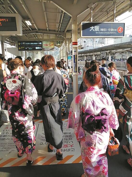 花火大会开始时间是8月10日晚上七点四十分,但当天下午四点多,大阪的地铁里便见一些穿着和服以及木屐者的日本年轻男女,他们都是去参加花火大会的。